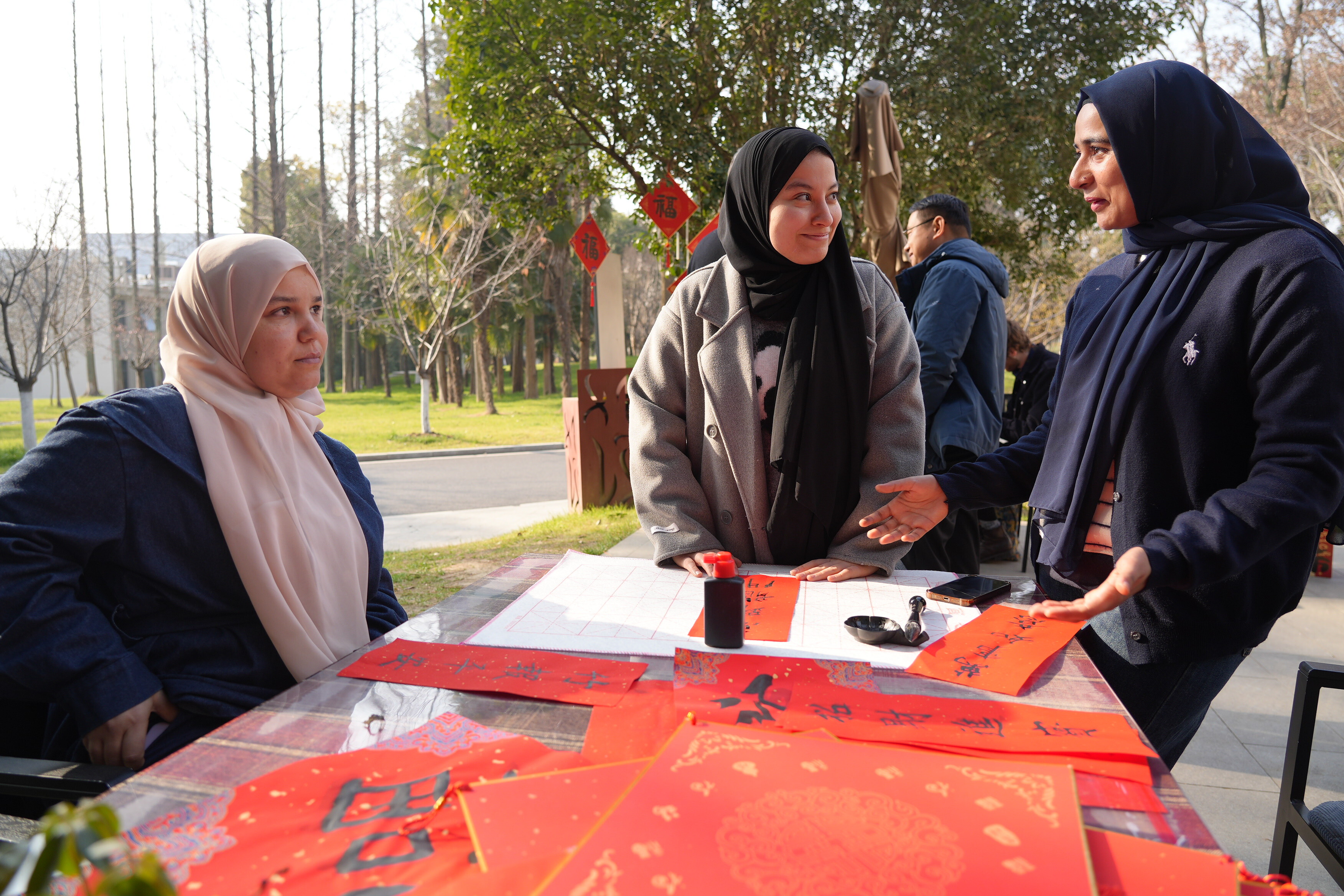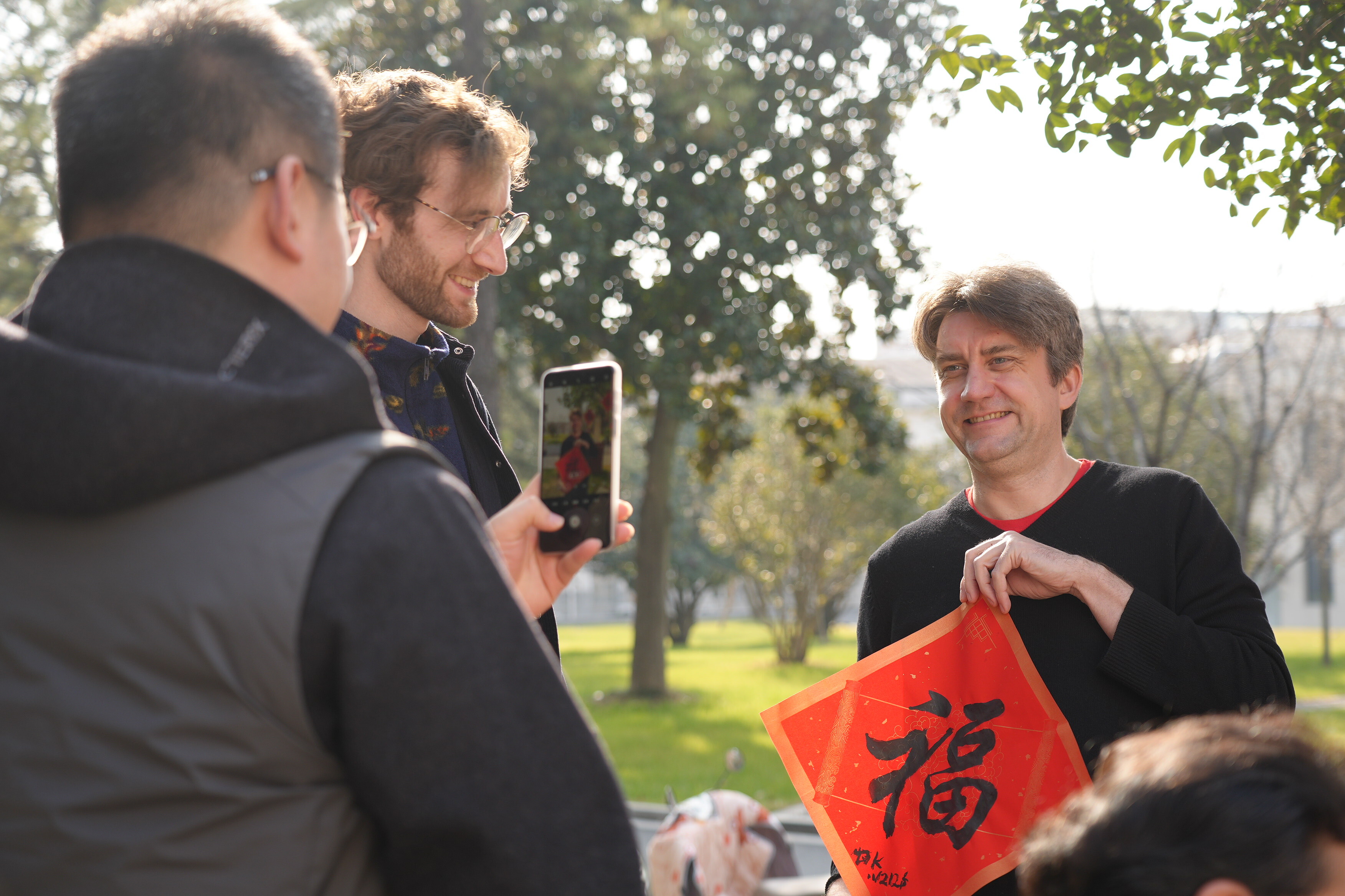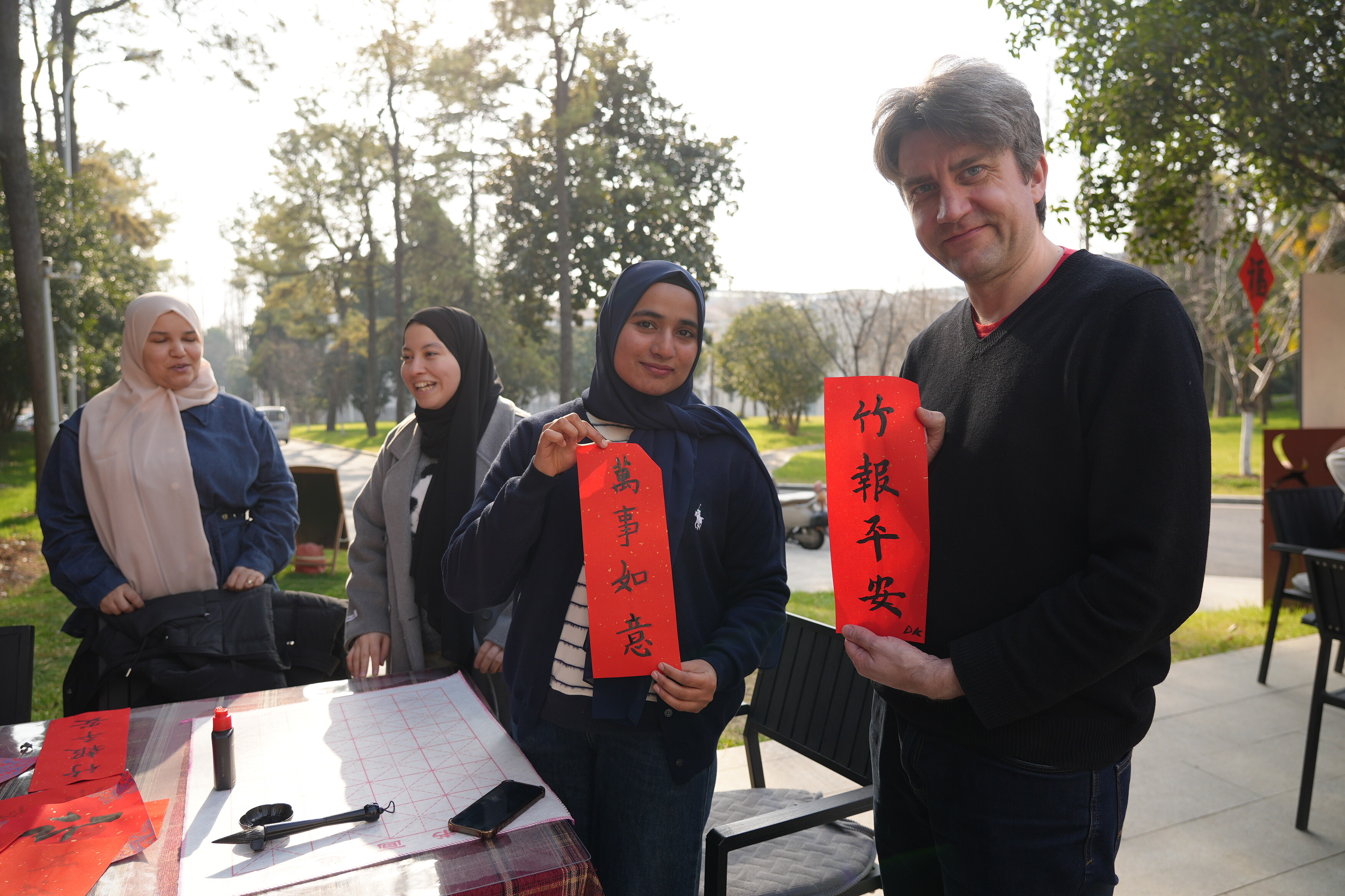 The atmosphere was warm and festive. Red paper, black ink, and smiling faces brought vibrant energy to the outdoor venue as everyone immersed themselves in this meaningful cultural tradition. Many participants shared that it was their first time writing Chinese calligraphy, and they were excited to take home their own “Fu”character as a symbol of good luck for the New Year.