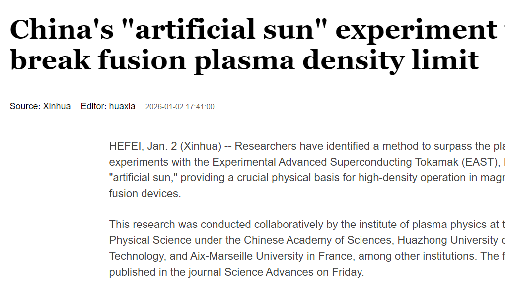 HEFEI, Jan. 16 (Xinhua) -- China is accelerating the transition of its nuclear fusion program from fundamental research to large-scale engineering, as construction of the Burning Plasma Experimental Superconducting Tokamak (BEST) gains momentum.