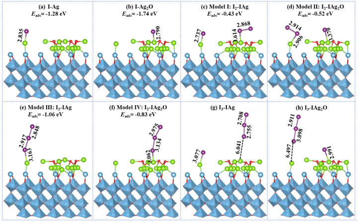 Optimized configurations of various iodine species adsorbed on adsorbent: (a-b) Adsorption of I- on AT nanocomposites; (c-f) Adsorption of I2 on I-AT nanocomposites; (g-h) Adsorption of I3- on I-AT nanocomposites. (Image by CHEN Kaiwen)
